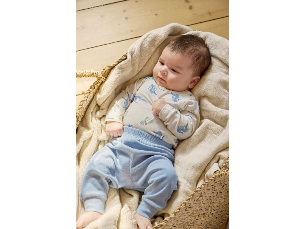 Jednofarebné nohavice voľného strihu s gumou v páse vo vrúbkovanom prevedení. Vyrobené z mäkkého bambusového a bavlneného materiálu.