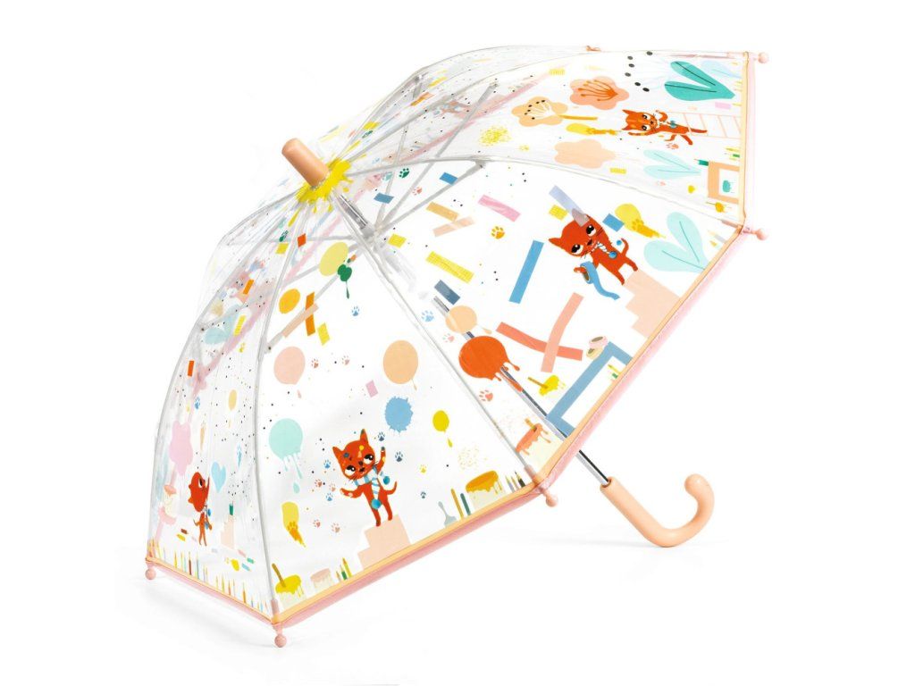 Vyberte sa s mačkou maliarkou na farebnú prechádzku v daždi! Detský palicový dáždnik z priehľadného plastu s ilustráciami mačky maliarky má 8-ramennú plastovú kostru spevnenú skleným vláknom, vďaka čomu je ľahká a pevná zároveň. Okraj dáždnika je obšitý textilným lemom a k jednotlivým plastovým koncovkám pripevnený niťou. Stredová tyč je kovová, s matnou plastovou rúčkou. Dáždnik sa otvára/zatvára manuálne, jednoduchým a bezpečným roztvorením/stiahnutím bez zaseknutia prstov. Kráčať s dáždnikom ako dospelák je veľká zábava!