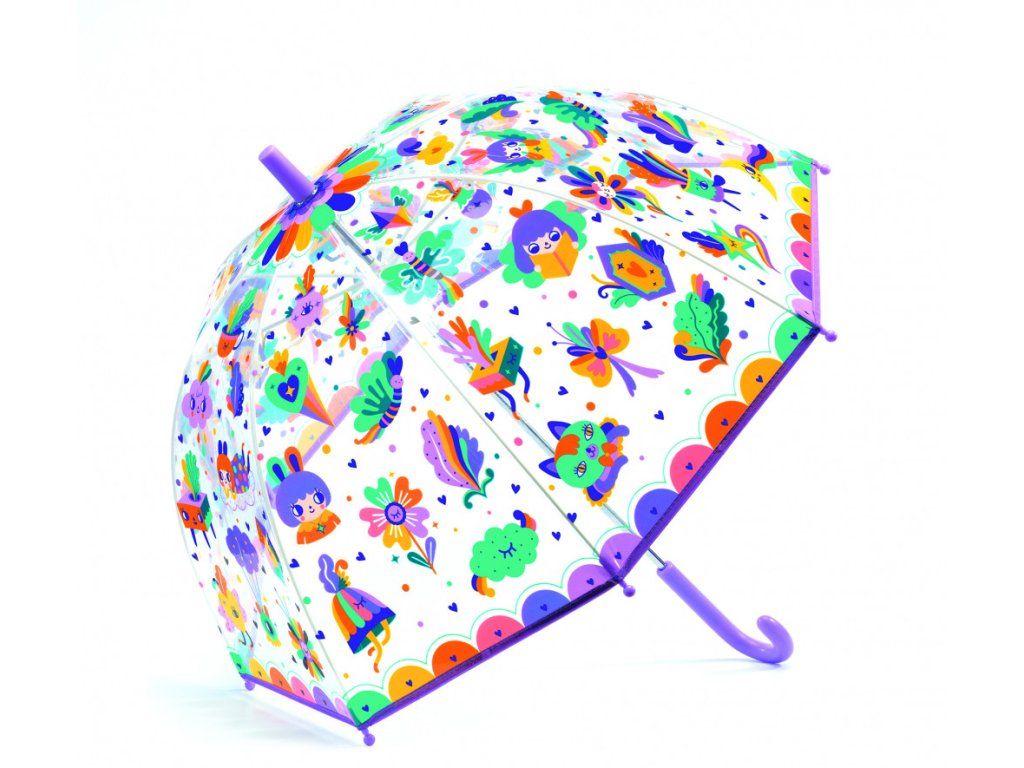 Detský palicový dáždnik z priehľadného plastu so žiarivo popovými kawaii ilustráciami. Okraj dáždnika je obšitý textilným lemom a k jednotlivým plastovým koncovkám pripevnený niťou. 8-ramenná kostra dáždnika je plastová, spevnená skleným vláknom, vďaka čomu je ľahká a pevná zároveň. Stredová tyč je kovová, s matnou plastovou rúčkou. Dáždnik sa otvára/zatvára manuálne, jednoduchým a bezpečným roztvorením/stiahnutím bez zaseknutia prstov.