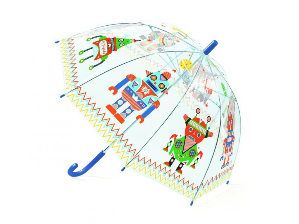 Detský palicový dáždnik z priehľadného plastu s ilustráciami robotov. Okraj dáždnika je obšitý textilným lemom a k jednotlivým plastovým koncovkám pripevnený niťou. Kostra dáždnika je plastová, spevnená skleným vláknom, vďaka čomu je ľahká a pevná zároveň. Stredová tyč je kovová s matnou plastovou rúčkou. Dáždnik sa otvára/zatvára manuálne, jednoduchým a bezpečným roztvorením/stiahnutím bez zaseknutia prstov.