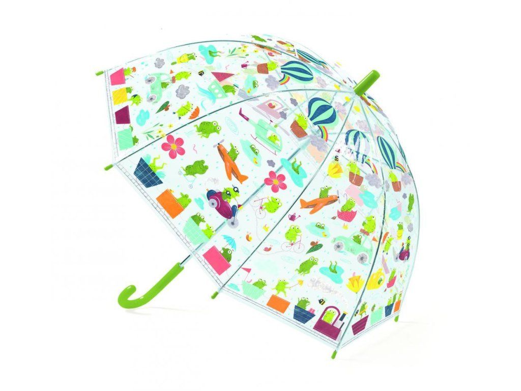 Detský palicový dáždnik z priehľadného plastu s veselými ilustráciami žabiek. Okraj dáždnika je obšitý textilným lemom a k jednotlivým plastovým koncovkám pripevnený niťou. Kostra dáždnika je plastová, spevnená skleným vláknom, vďaka čomu je ľahká a pevná zároveň. Stredová tyč je kovová s matnou plastovou rúčkou. Dáždnik sa otvára/zatvára manuálne, jednoduchým a bezpečným roztvorením/stiahnutím bez zaseknutia prstov.