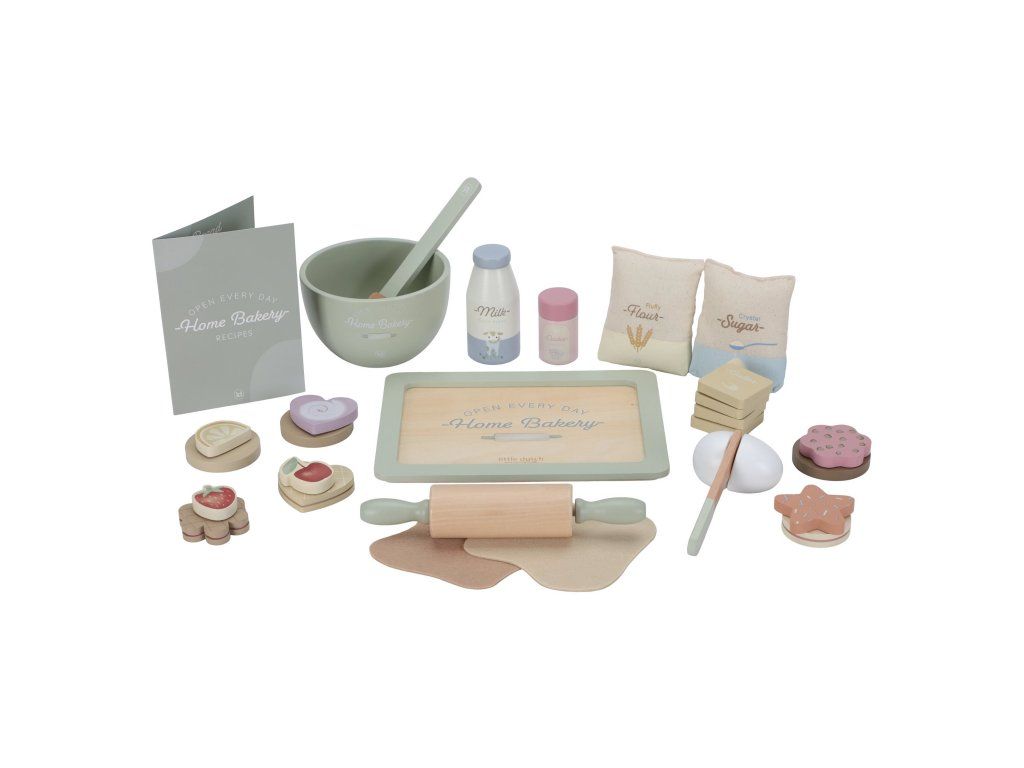 Sada obsahuje všetko potrebné na pečenie: kartičku s receptom, drevené suroviny ako vajcia, maslo, múku, cukor, mlieko, farebné posypky ak tomu misu na miešanie, valček, tácku a doplnky na zdobenie. Nechýbajú ani hotové kúsky cukroviniek a plát cesta z plsti, ktorý si môžu deti rozváľať a nazdobiť podľa vlastnej fantázie. Súprava prináša hodiny nápaditej a tvorivej zábavy, podporuje predstavivosť, kreativitu a jemnú motoriku.Ideálna ako samostatná hračka alebo ako doplnok k samostatne predávanej detskej kuchynke.