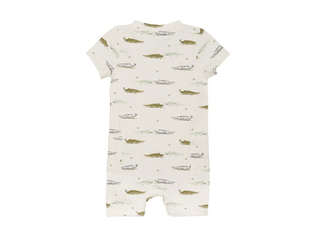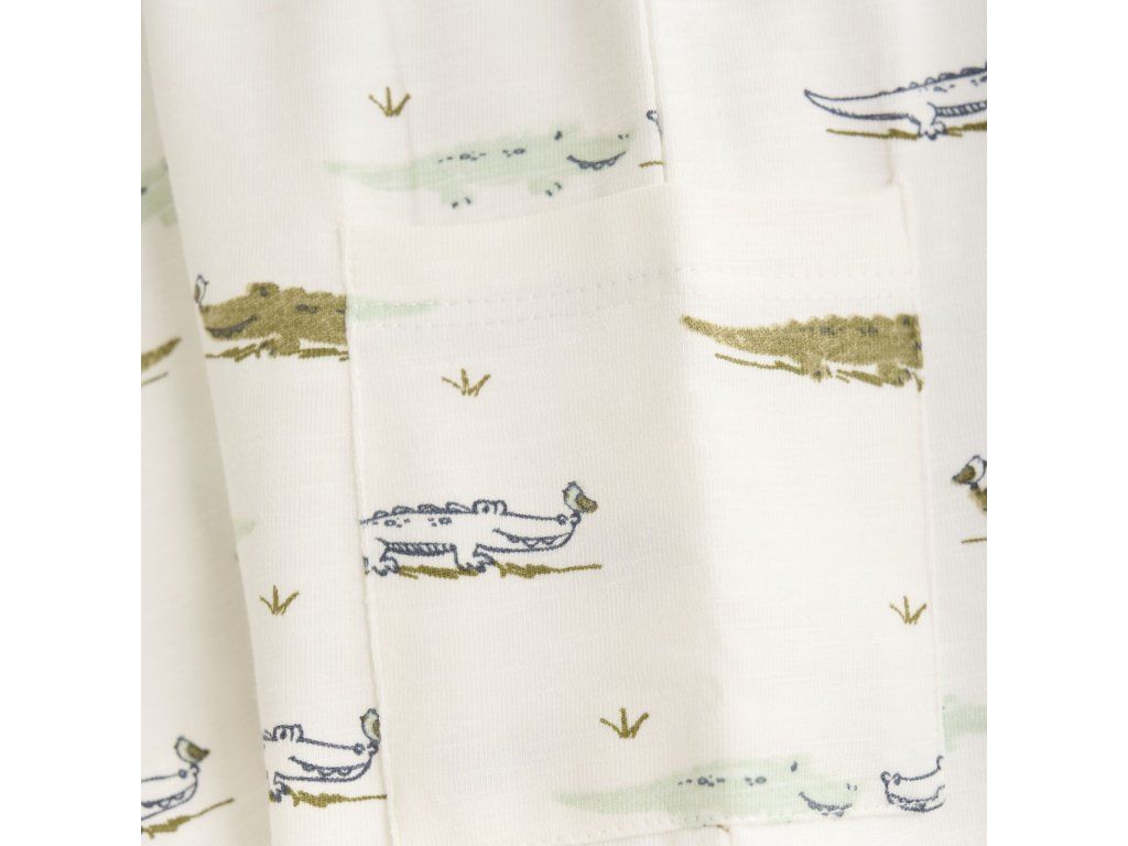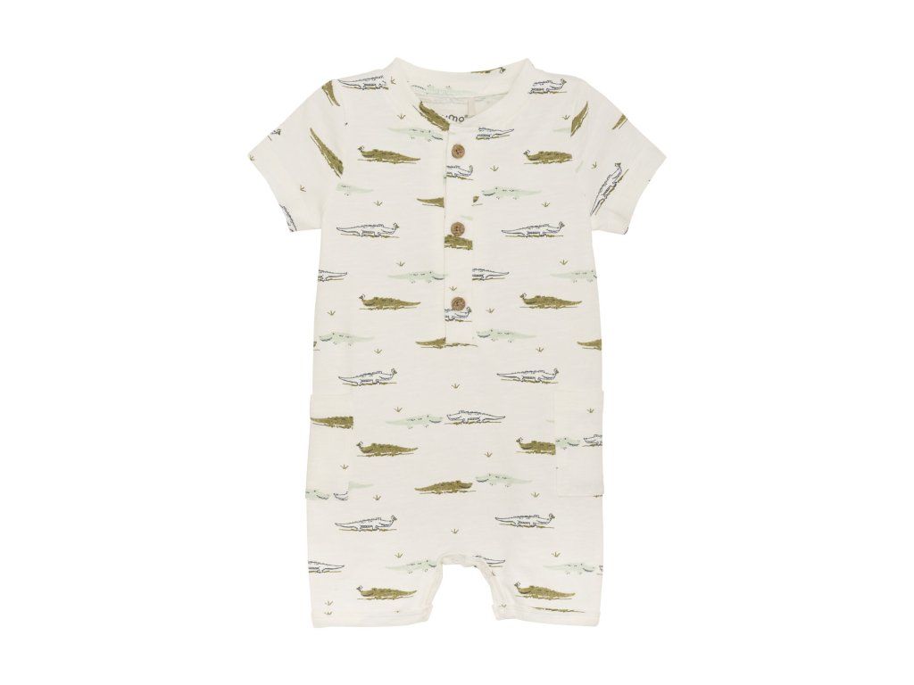 Roztomilý overal s krátkym rukávom s celoplošnou potlačou krokodílov. Je vyrobený z mäkkej bavlnenej zmesi, ktorá je príjemná na pokožke. Má bočné vrecká s logom Minymo na jednom. Zapína sa vpredu na gombíky a patentky medzi nožičkami.
