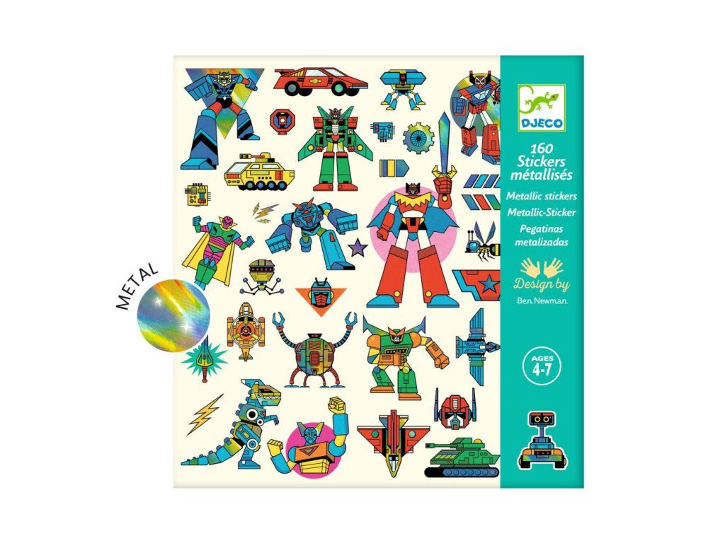 Samolepky s motívom retro robotov v “mecha manga” štýle. Farebné ilustrácie sú ozvláštnené strieborným metalickým leskom s dúhovým efektom. Samolepky sú použiteľné samostatne alebo ako doplnok kresbičiek. Sú jednorazové, nie sú odlepiteľné. Sada je vhodná ako malý darček.