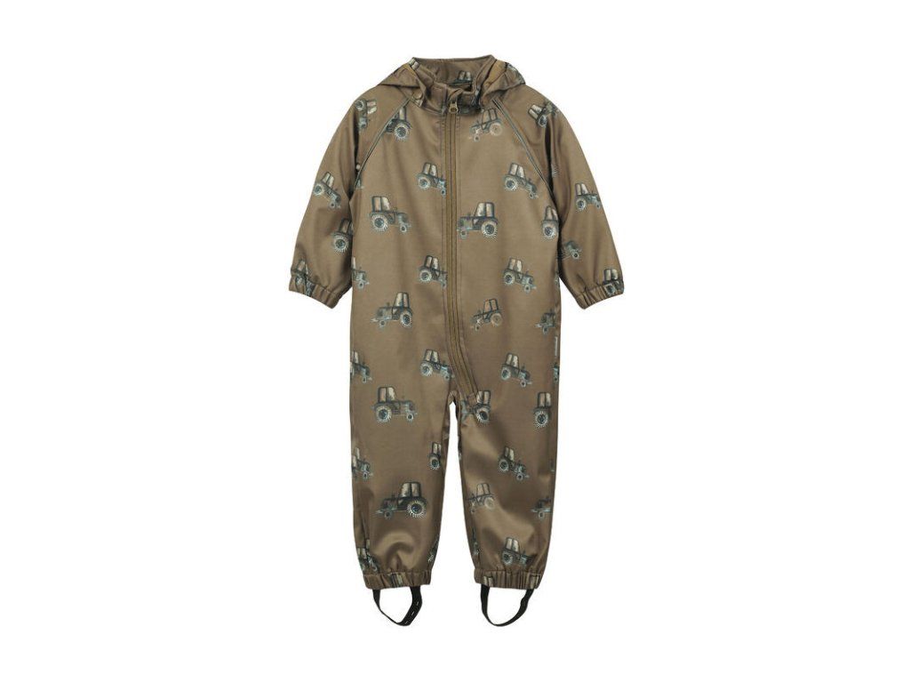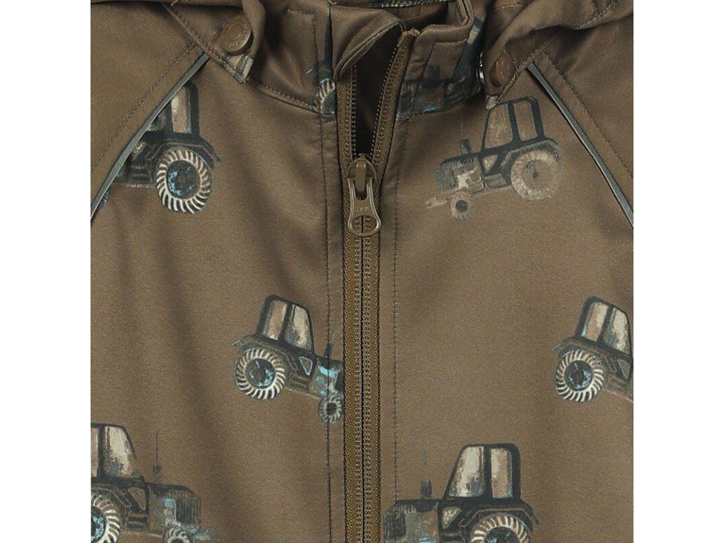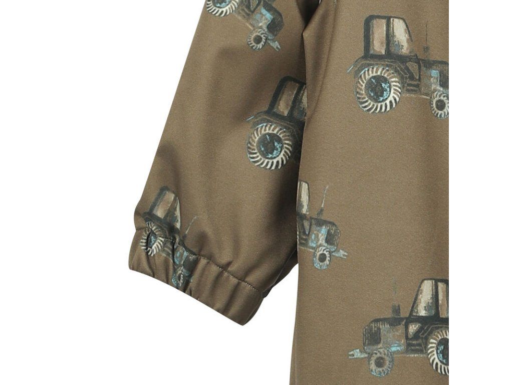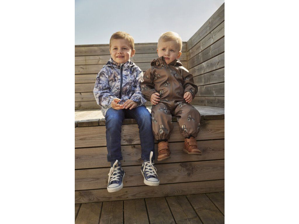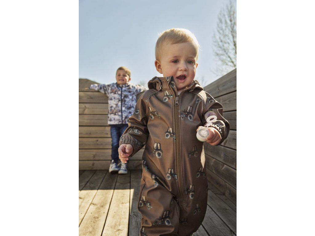 Praktický softshellový overal s celoplošnou potlačou pekných kvetov a gumou na zápästiach, kapucni, okolo členkov a v spodnej časti. Má zapínanie na zips s ochranou brady, odnímateľnú kapucňu a popruhy na topánky.