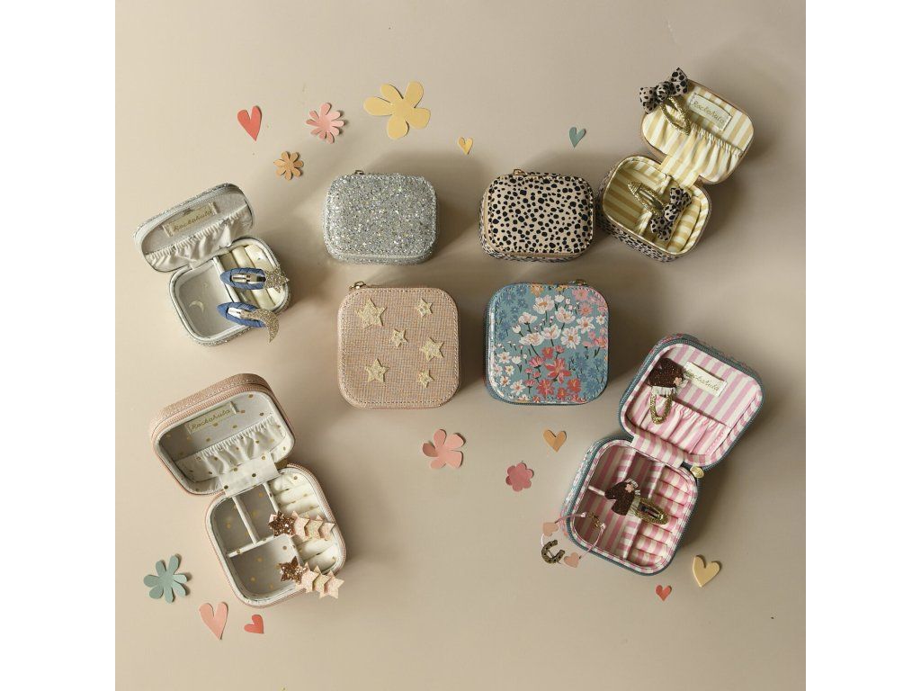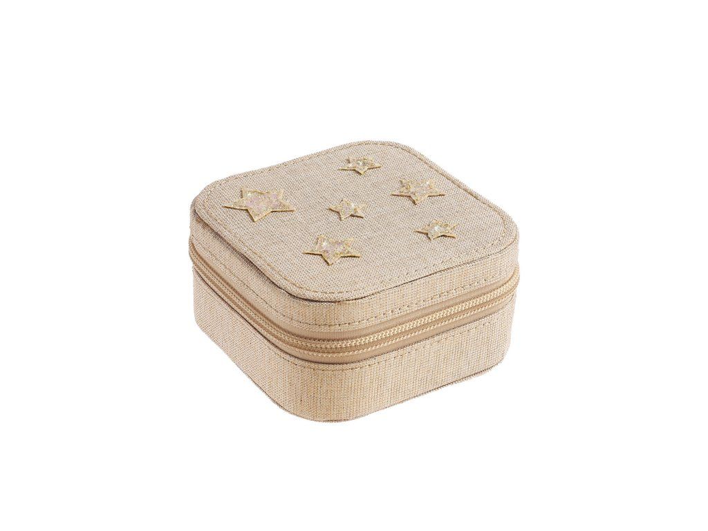 Pokrytý ružovou trblietavou látkou a zdobený lesklými trblietavými hviezdami. Po otvorení zipsu odhalí priehradku, vnútorné vrecko a špeciálne miesto na vkladanie náušníc a prsteňov. Celé vnútro je vystlané super jemnou zlatou bodkovanou látkou!