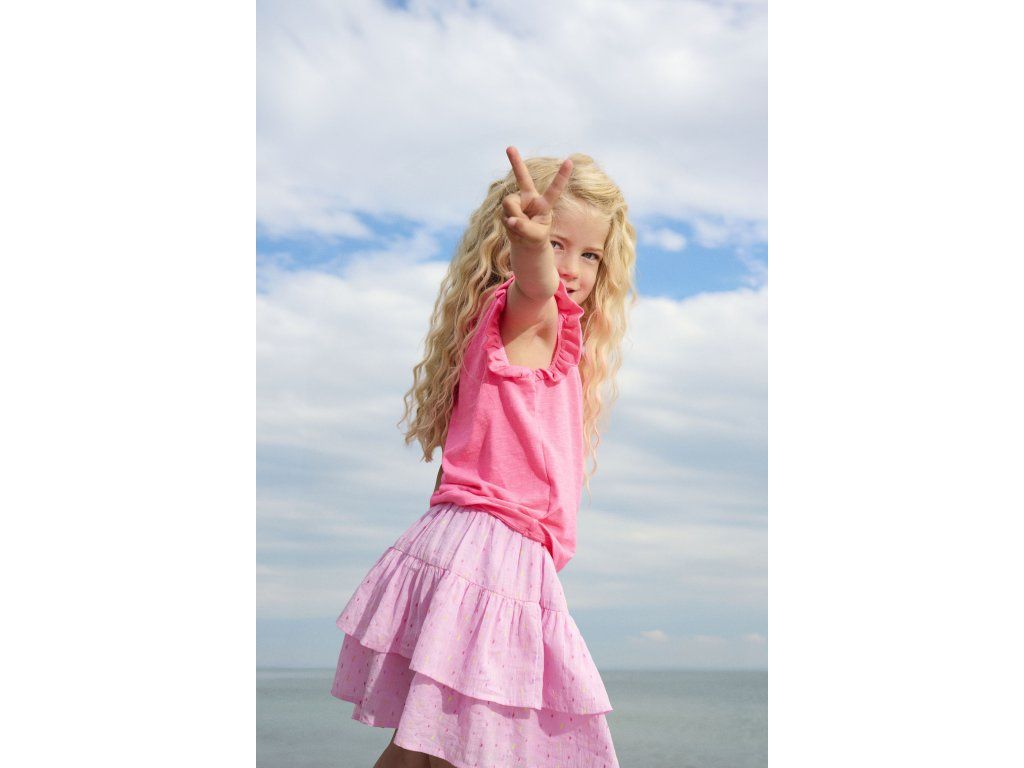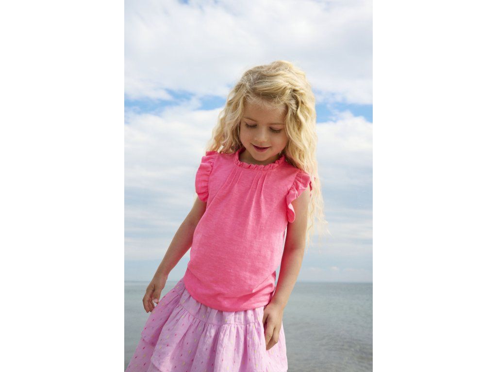 Tričko je vyrobené z príjemnej polyesterovej zmesi a má výrazne volániky na ramenách. Voľný a pohodlný strih umožňuje úplnú slobodu pohybu.
